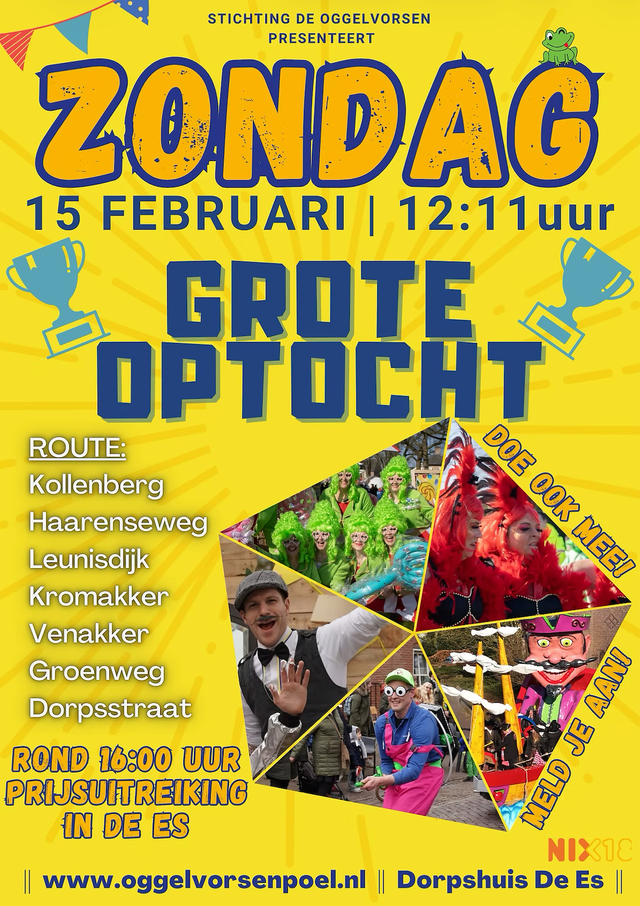 Traditioneel wordt de grote optocht op carnavals zondag gehouden in de straten van Oggelvorsenpoel. Deze optocht kenmerkt zich door de vele mooie loopgroepen met geweldig straat theater. Heb je zin om mee te doen, of om te komen kijken, de optocht start om 12:11 in de Haarense weg en eindigd rond 15:00 uur op de groenweg. Na de optocht is de gezellige prijsuitrijking in Dorpshuis de Es op de markt.